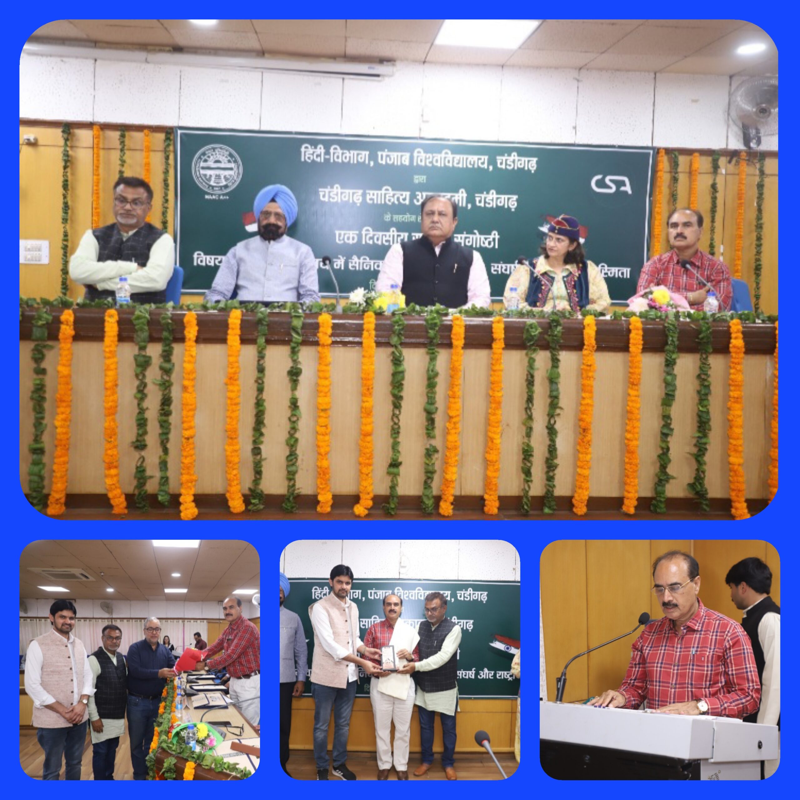 हिंदी-विभाग पंजाब विश्वविद्यालय, चंडीगढ़ एवं चंडीगढ़ साहित्य अकादमी, चंडीगढ़ के संयुक्त तत्वावधान से पंजाब विश्वविद्यालय के स्वर्ण जयंती सभागार में “भारतीय वाङ्मय में सैनिक विमर्श : अनुभव, संघर्ष और राष्ट्रीय अस्मिता” विषय पर एक दिवसीय राष्ट्रीय संगोष्ठी का सफल आयोजन किया गया। संगोष्ठी का उद्देश्य सैनिकों के अनुभवों का साहित्यिक विश्लेषण करना था। उद्घाटन सत्र में हिंदी विभागाध्यक्ष एवं संगोष्ठी संयोजक प्रो. अशोक कुमार ने अतिथियों का स्वागत करते हुए संगोष्ठी की प्रासंगिकता पर अपने विचार प्रस्तुत किए। डॉ० अश्वनी शांडिल्य (असिस्टेंट प्रोफेसर हिंदी, जिला शिक्षा एवं प्रशिक्षण संस्थान, पंचकूला) ने परमवीर चक्र विजेता कैप्टन विक्रम बत्रा तथा कीर्ति चक्र विजेता कर्नल मनप्रीत सिंह के जीवन और उपलब्धियों पर प्रकाश डाला। उद्घाटन भाषण में श्री विशाल बत्रा (व्यवसाय प्रमुख, रक्षा, सरकारी और संस्थागत बैंकिंग, आई. सी. आई. सी. आई. बैंक लिमिटेड, मुंबई) ने अपने भाई कैप्टन विक्रम बत्रा से जुड़ी यादों को सांझा करते हुए उनके शौर्यमयी व्यक्तित्व पर प्रकाश डालते हुए कहा कि ‘वर्दी से बड़ी कोई शान नहीं होती और देश सेवा से बड़ा कोई धर्म नहीं होता।’ बीज वक्तव्य में डॉ. अरुण कुमार (प्राचार्य, पी. एम. श्री केंद्रीय विद्यालय क्रमांक 1, पटियाला छावनी) ने भारतीय वाङ्मय में सैनिक विमर्श पर अपने विचार प्रस्तुत किए। विशिष्ट अतिथि श्रीमती जगमीत ग्रेवाल (व्याख्याता अर्थशास्त्र, एजुसेट, हरियाणा, सैक्टर-2, पंचकूला) ने सैनिकों के शौर्य और उनके जीवन से प्रेरित लेखन के ऊपर अपने विचार साझा किए।