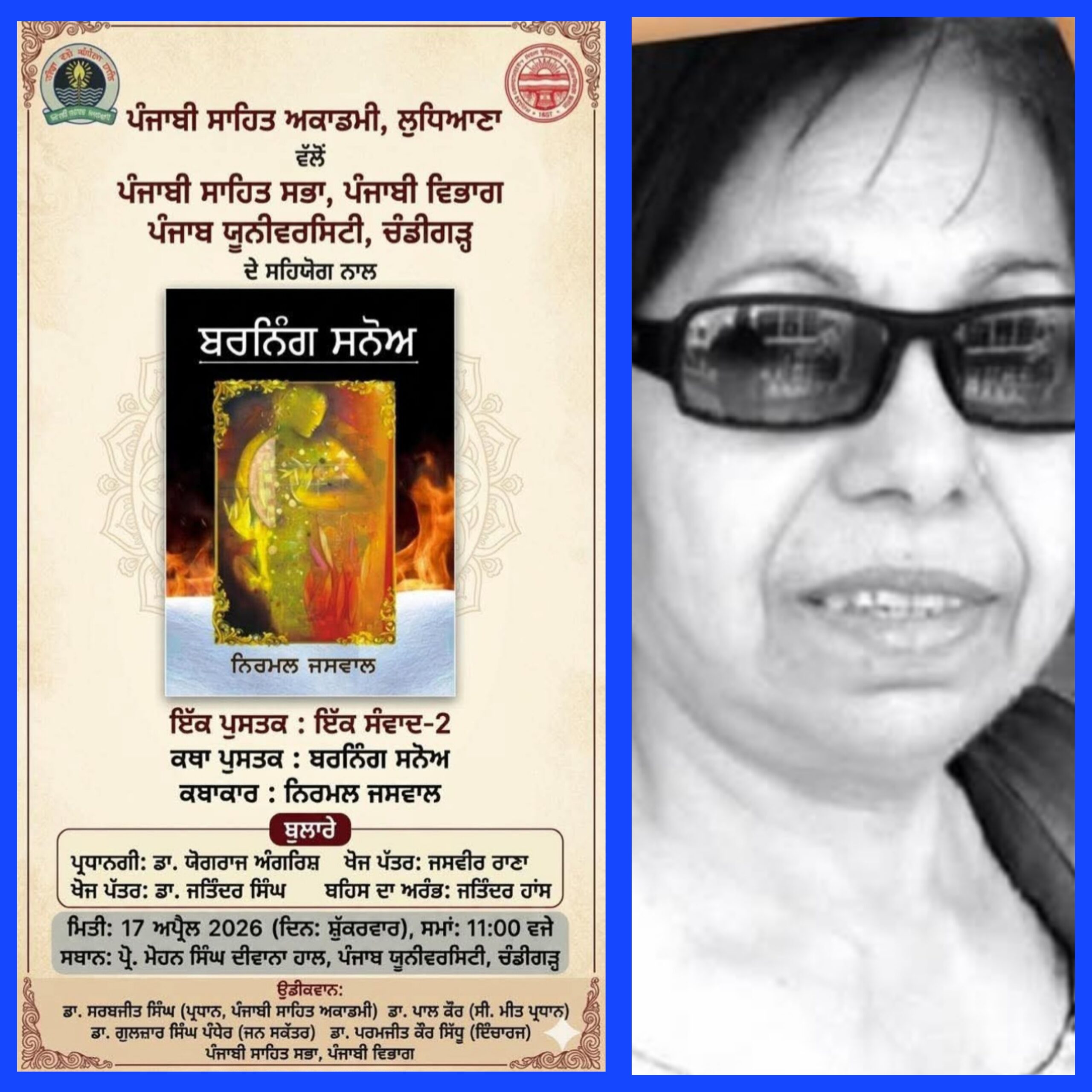 ਪੰਜਾਬੀ ਸਾਹਿਤ ਅਕਾਡਮੀ, ਲੁਧਿਆਣਾ ਵੱਲੋਂ ਪੰਜਾਬੀ ਸਾਹਿਤ ਸਭਾ, ਪੰਜਾਬੀ ਵਿਭਾਗ ਦੇ ਸਹਿਯੋਗ ਨਾਲ਼ ਇੱਕ ਪੁਸਤਕ: ਇੱਕ ਸੰਵਾਦ-2 ਅਨੁਵਾਨ ਤਹਿਤ ਕਥਾਕਾਰ ਨਿਰਮਲ ਜਸਵਾਲ ਦੀ ਕਥਾ ਪੁਸਤਕ ‘ਬਰਨਿੰਗ ਸਨੋਅ’ ਸਬੰਧੀ ਮਿਤੀ 17 ਅਪ੍ਰੈਲ, 2026 ਨੂੰ ਸਵੇਰੇ 11.00 ਵਜੇ ਪ੍ਰੋ. ਮੋਹਨ ਸਿੰਘ ਦੀਵਾਨਾ ਹਾਲ, ਪੰਜਾਬ ਯੂਨੀਵਰਸਿਟੀ, ਚੰਡੀਗੜ੍ਹ ਵਿਖੇ ਸੰਵਾਦ ਰਚਾਇਆ ਜਾ ਰਿਹਾ ਹੈ। ਅਕਾਡਮੀ ਦੇ ਪ੍ਰਧਾਨ ਡਾ. ਸਰਬਜੀਤ ਸਿੰਘ ਵੱਲੋਂ ਜਾਰੀ ਕੀਤੇ ਪੋਸਟਰ ਅਨੁਸਾਰ ਇਸ ਸਮਾਗਮ ਦੀ ਪ੍ਰਧਾਨਗੀ ਡਾ. ਯੋਗਰਾਜ ਅੰਗਰਿਸ਼ ਕਰ ਰਹੇ ਹਨ, ਜਦਕਿ ਜਸਵੀਰ ਰਾਣਾ ਅਤੇ ਡਾ. ਜਤਿੰਦਰ ਸਿੰਘ ਖੋਜ ਪੱਤਰ ਪੇਸ਼ ਕਰਨਗੇ। ਪੁਸਤਕ ‘ਤੇ ਬਹਿਸ ਦਾ ਅਰੰਭ ਜਤਿੰਦਰ ਹਾਂਸ ਵੱਲੋਂ ਕੀਤਾ ਜਾਵੇਗਾ।