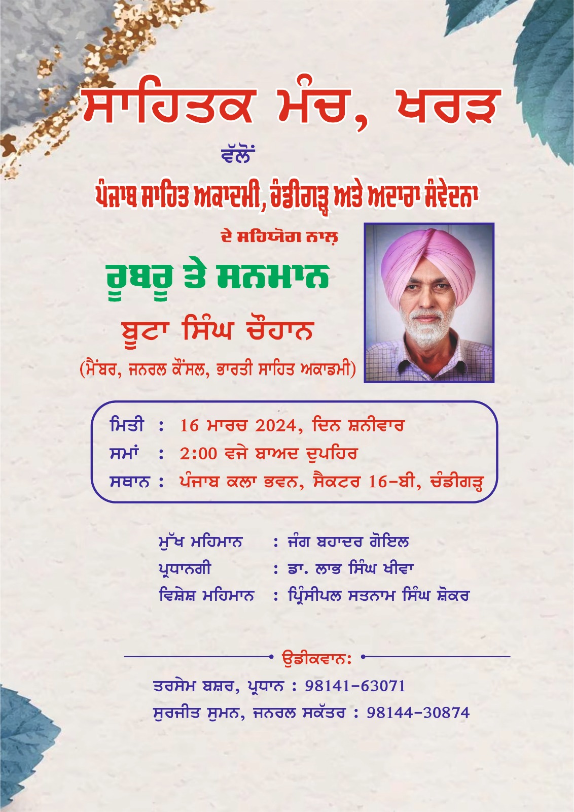 ਸਾਹਿਤਕ ਮੰਚ ਖਰੜ ਵੱਲੋਂ ਪੰਜਾਬ ਸਾਹਿਤ ਅਕਾਦਮੀ ਅਤੇ ਅਦਾਰਾ ਸੰਵੇਦਨਾ ਦੇ ਸਹਿਯੋਗ ਨਾਲ਼ ਬੂਟਾ ਸਿੰਘ ਚੌਹਾਨ ਦਾ ਰੂਬਰੂ ਤੇ ਸਨਮਾਨ ਸਮਾਗਮ ਕਰਵਾਇਆ ਜਾ ਰਿਹਾ ਹੈ।