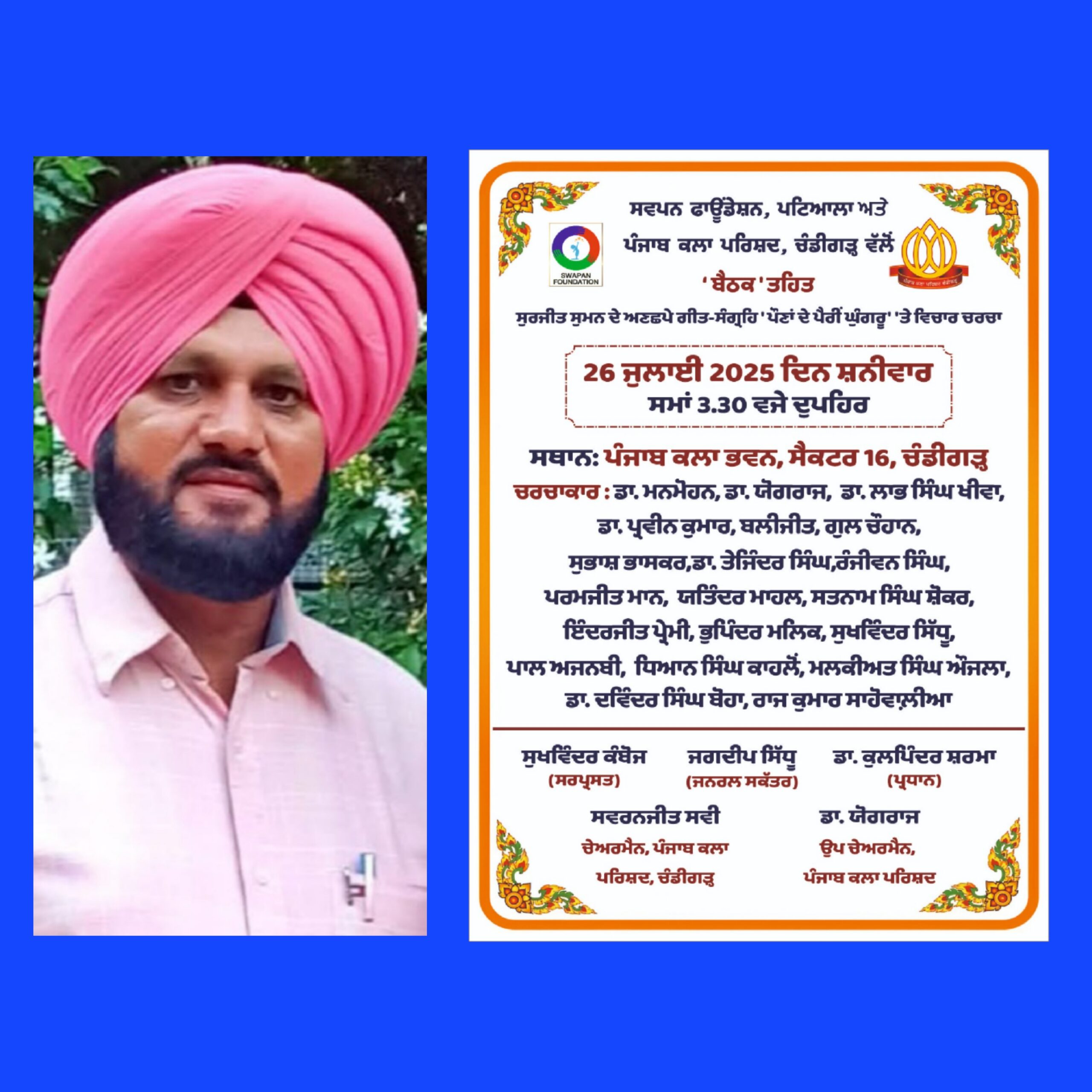 ਸਵਪਨ ਫਾਊਂਡੇਸ਼ਨ, ਪਟਿਆਲ਼ਾ ਅਤੇ ਪੰਜਾਬ ਕਲਾ ਪਰਿਸ਼ਦ , ਚੰਡੀਗੜ੍ਹ ਵੱਲੋਂ ‘ਬੈਠਕ’ ਤਹਿਤ ਸੁਰਜੀਤ ਸੁਮਨ ਦੇ ਅਣਛਪੇ ਗੀਤ-ਸੰਗ੍ਰਹਿ ‘ਪੌਣਾਂ ਦੇ ਪੈਰੀਂ ਘੁੰਗਰੂ’ ‘ਤੇ 26 ਜੁਲਾਈ 2025 ਨੂੰ ਬਾਅਦ ਦੁਪਹਿਰ 3.30 ਵਜੇ ਪੰਜਾਬ ਕਲਾ ਭਵਨ, ਸੈਕਟਰ 16, ਚੰਡੀਗੜ੍ਹ ਵਿਖੇ ਵਿਚਾਰ ਚਰਚਾ ਕਰਵਾਈ ਜਾ ਰਹੀ ਹੈ।