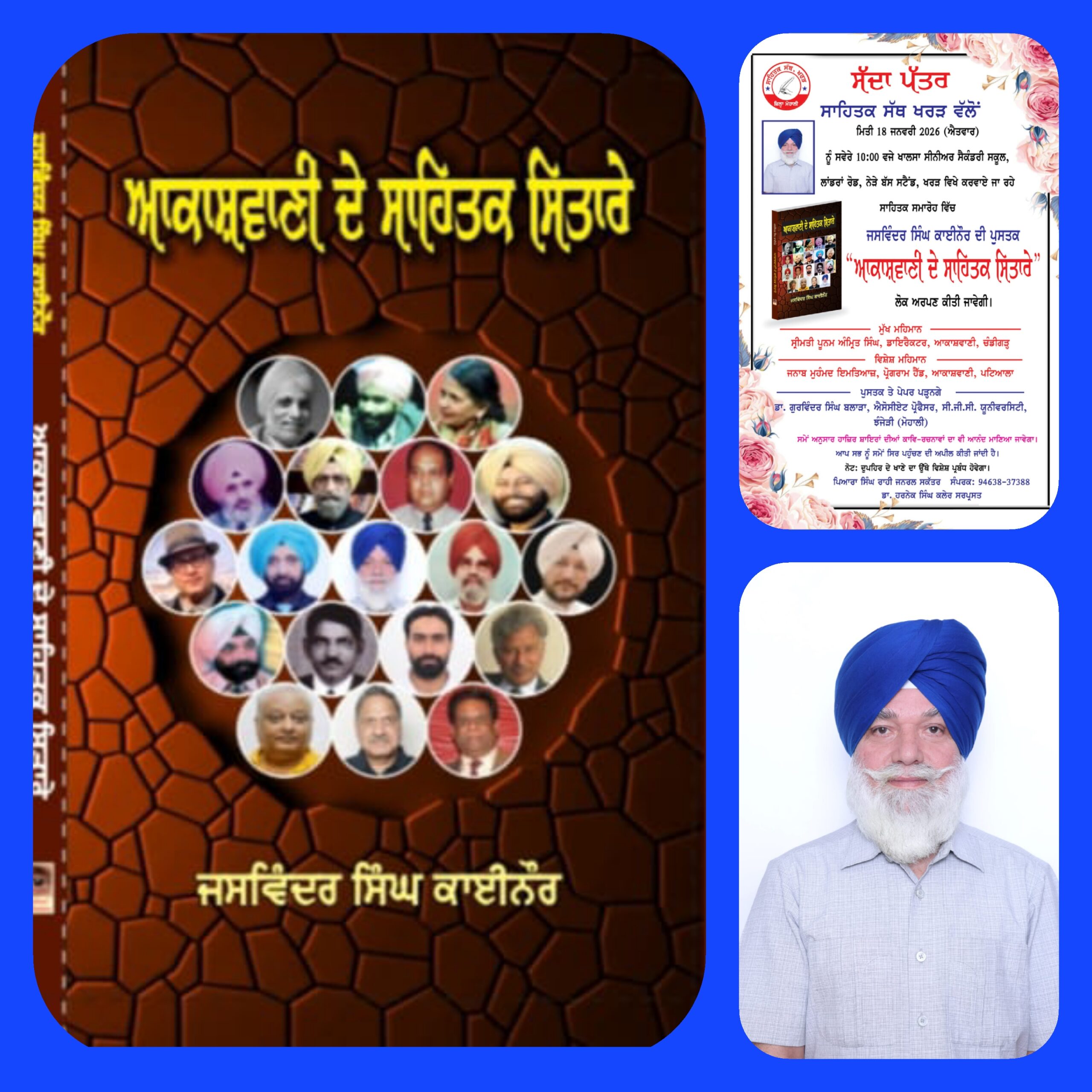 ਸਾਹਿਤਕ ਸੱਥ ਖਰੜ ਵੱਲੋਂ ਸੱਥ ਦੇ ਪ੍ਰਧਾਨ ਅਤੇ ਸਾਹਿਤਕਾਰ ਜਸਵਿੰਦਰ ਸਿੰਘ ਕਾਈਨੌਰ ਦੀ ਨਿਵੇਕਲੀ ਪੁਸਤਕ “ਆਕਾਸ਼ਵਾਣੀ ਦੇ ਸਾਹਿਤਕ ਸਿਤਾਰੇ“ ਦਾ ਲੋਕ ਅਰਪਣ ਮਿਤੀ 18 ਜਨਵਰੀ 2026, ਦਿਨ ਐਤਵਾਰ ਨੂੰ ਸਵੇਰੇ 10.00 ਵਜੇ ਖ਼ਾਲਸਾ ਸੀਨੀਅਰ ਸੈਕੰਡਰੀ ਸਕੂਲ ਖਰੜ ਵਿਖੇ ਕਰਵਾਇਆ ਜਾ ਰਿਹਾ ਹੈ।
